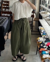 袖はフレンチスリーブで涼しく、首まわりのみギャザーが入っていて可愛くなりすぎない大人のブラウスです。